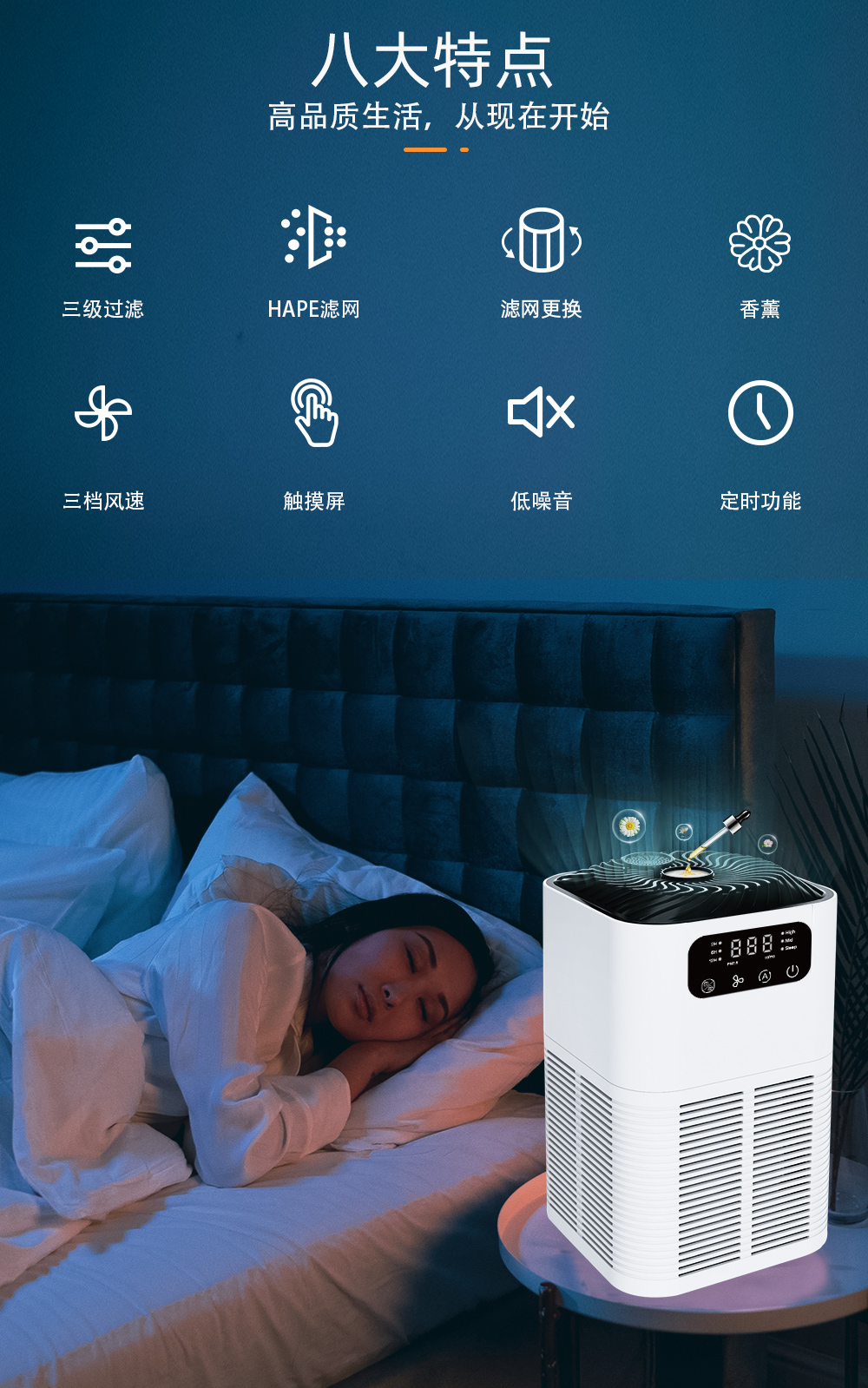 香薰功能:配備香薰墊,可添加2-3滴您喜愛的精油,為整個空間帶來自然清新的香氣。
