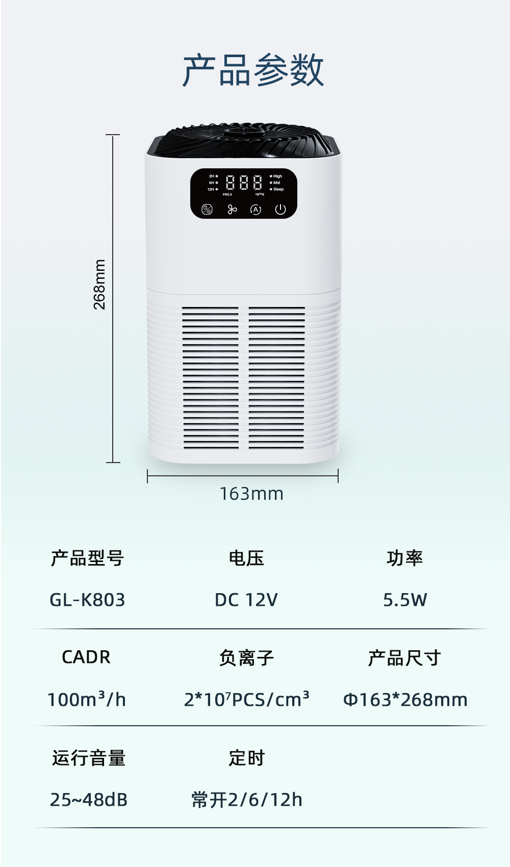 高效淨化:GL-K803擁有每小時高達100立方米的空氣淨化速率(CADR),無論您放置在何處,均能快速淨化空氣。