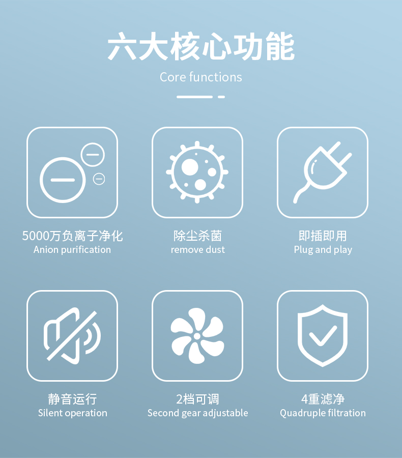 5000萬負離子:小身材,大能量,持續釋放負離子,快速吸收和中和有害物質,促進人體新陳代謝,提高免疫力,調節人體平衡,為你創造獨屬於你的負離子氧吧。